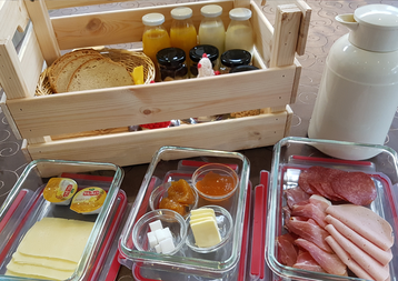 - 4 Brötchen, 1 Kanne Kaffee/Tee, Schinken, Wurst, Käse, Butter, Fruchtaufstrich, Joghurt mit Obst, Müsli, frische Roh-Milch, Saft und zwei gekochte Eier,Kuchen und Piccolo